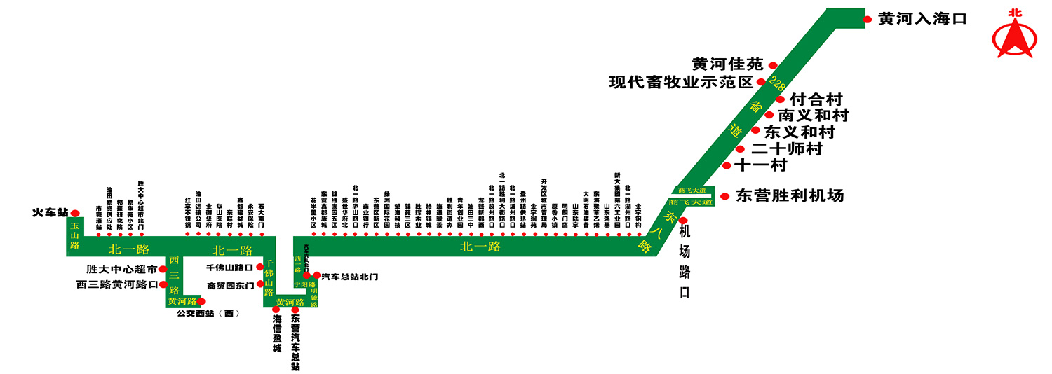 下行自公交西站始發(fā),經黃河路、西三路、北一路、玉山路(火車站調頭)、北一路、千佛山路、黃河路、明鏡路、寧陽路、西一路、北一路、東八路、商飛大道(勝利機場調頭)、東八路、228省道、024鄉(xiāng)道到達終點站“黃河入海口”;上行按上述路線返回。