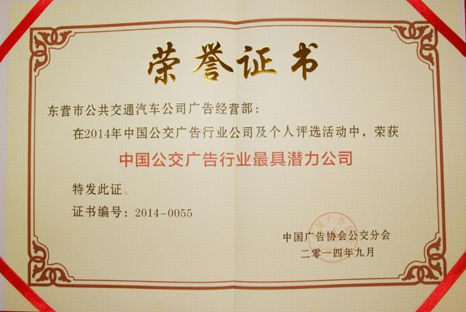 市公交公司廣告部榮獲“中國(guó)公交廣告行業(yè)最具潛力公司”榮譽(yù)稱號(hào)