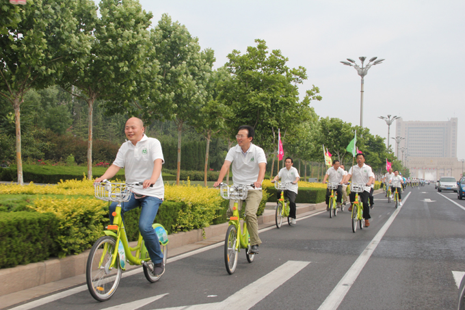 上午九時(shí),來自市公交公司和環(huán)保局的70余名志愿者匯集在黃河影劇院停車場,統(tǒng)一騎行公共自行車,身著統(tǒng)一環(huán)保T恤,由黃河影劇院出發(fā),行經(jīng)府前大街—?jiǎng)倮蠼帧獮H河路—東三路等東城區(qū)主要繁華路段,開展了浩浩蕩蕩的綠色騎行宣傳活動。