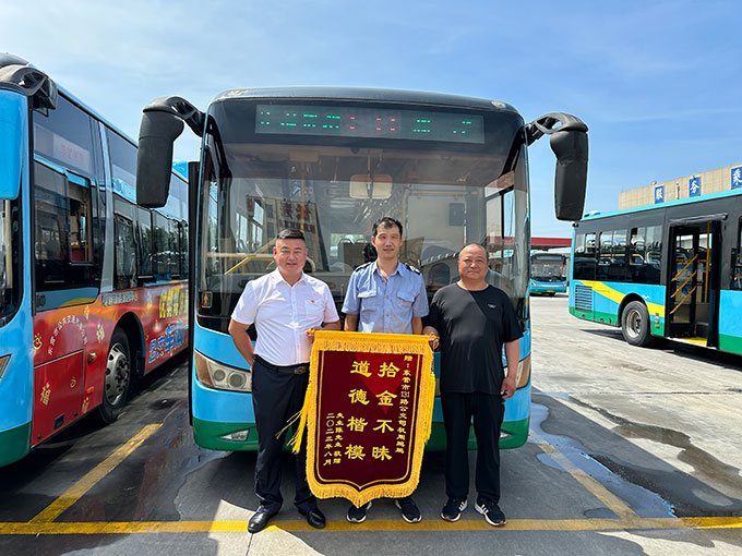 8月1日,陳先生將一面寫有“拾金不昧,道德楷?!钡腻\旗送到市公交集團(tuán)汽車六隊(duì),感謝131路駕駛員周鵬鵬師傅拾金不昧。