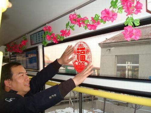 元月11日春運(yùn)第一天,公交公司8路車組工作人員忙著將自費(fèi)購(gòu)買的彩色拉花、剪紙等飾品,張貼、懸掛在車廂內(nèi),積極營(yíng)造出春運(yùn)溫馨和諧的喜慶氣氛,與乘客一起喜迎春節(jié)的到來(lái)。