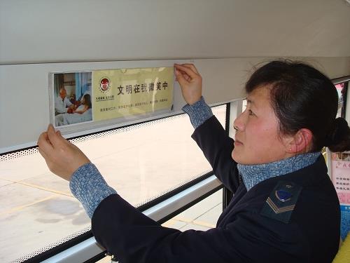 12月11日,市公交公司汽車七隊8路車組的工作人員把“從我做起,走向文明”的宣傳條幅安裝在車廂,增強公交文明教育對社會的示范性和輻射性。