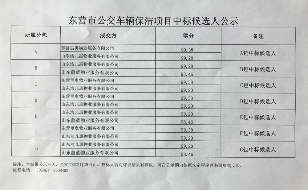 東營市公交車輛保潔項目中標候選人公示