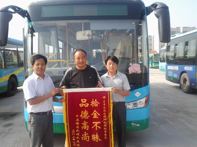 2013年7月29日,東營區(qū)牛莊鎮(zhèn)東武村的武連港師傅為公交車駕駛員李金泉送來了一面“拾金不昧、品德高尚”的錦旗表示感謝。