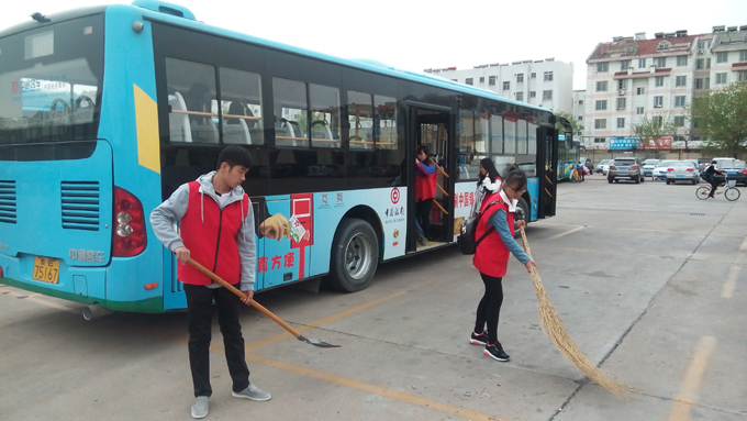 來自東營職業(yè)學(xué)院青年志愿者協(xié)會(huì)的學(xué)生和市公交公司汽車一隊(duì)職工共計(jì)30余人,分成兩個(gè)小組,一組打掃停車場(chǎng)衛(wèi)生,撿拾地上果皮紙屑,另外一組幫助駕駛員擦拭車身,清掃車廂衛(wèi)生。大家干得熱火朝天,不到兩個(gè)小時(shí),公交車和停車場(chǎng)被大家打掃得干干凈凈。