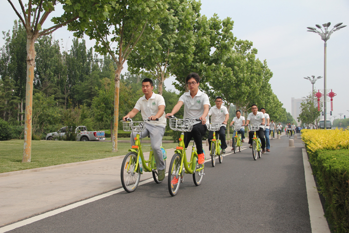 上午九時(shí),來自市公交公司和環(huán)保局的70余名志愿者匯集在黃河影劇院停車場,統(tǒng)一騎行公共自行車,身著統(tǒng)一環(huán)保T恤,由黃河影劇院出發(fā),行經(jīng)府前大街—?jiǎng)倮蠼帧獮H河路—東三路等東城區(qū)主要繁華路段,開展了浩浩蕩蕩的綠色騎行宣傳活動。