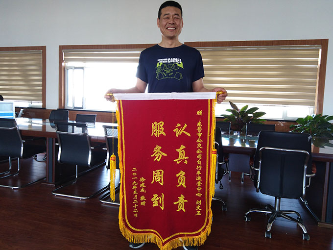 2019年5月28日下午,徐先生拿著一面寫(xiě)有“認(rèn)真負(fù)責(zé)、服務(wù)周到”的錦旗來(lái)到市公交公司公共自行車(chē)運(yùn)營(yíng)中心,感謝巡檢員劉文玉幫助找回丟失公共自行車(chē)認(rèn)真負(fù)責(zé)的態(tài)度和高尚品德。