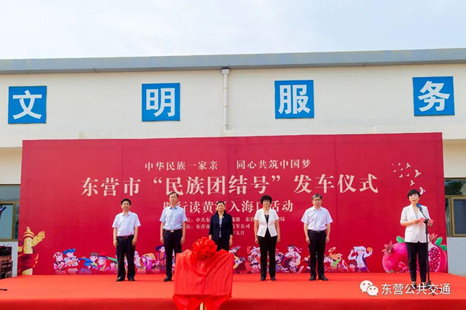 儀式現(xiàn)場,民族團結(jié)號公交車整裝待發(fā),車身煥然一新,貼有“中華民族一家親、同心共筑中國夢”“各民族像石榴籽一樣緊緊擁抱雜一起”等字樣,融入東營民族團結(jié)進步“石榴籽”“石榴花開黃河口”等地域元素,生動展示了各民族群眾在黃河入??跀y手團結(jié)奮斗、共創(chuàng)美好生活的故事,市公交公司黨委書記趙龍同志現(xiàn)場就民族團結(jié)號公交車籌備情況作了匯報。市交通運輸局黨組成員、市鐵路港航發(fā)展中心主任朱勝勇致辭,市人大常委會副主任張敏,市政協(xié)副主席王新明為東營市民族團結(jié)號揭牌,市委常委、統(tǒng)戰(zhàn)部部長郭艷發(fā)表講話,并宣布東營市民族團結(jié)號發(fā)車。