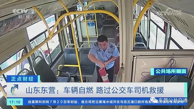 近日在東營(yíng),一輛正常行駛的車(chē)突然起火,而且是在車(chē)流量很大的道路中央。在等紅綠燈的東營(yíng)公交駕駛員張學(xué)成和商衛(wèi)東看到這一情況后,紛紛拿起車(chē)上的滅火器參與救援。