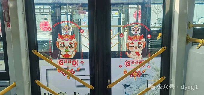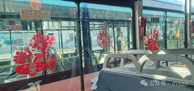 近日,為營(yíng)造更加濃厚的龍年新春氛圍,給市民更好的乘車(chē)體驗(yàn),東營(yíng)市公交集團(tuán)在部分公交車(chē)車(chē)廂掛上了一連串的龍年拉花,還貼上了喜慶的窗花、“龍”形狀的貼畫(huà)……打造“溫馨車(chē)廂”,讓乘客一進(jìn)車(chē)廂,就感受到濃厚的春節(jié)氛圍。