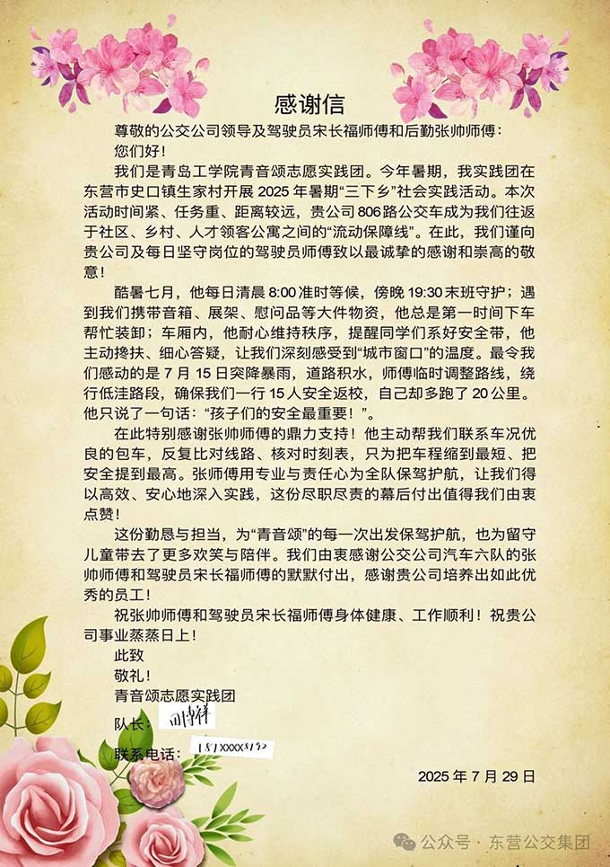 原來(lái),在今年的暑假期間,青音頌志愿實(shí)踐團(tuán)在東營(yíng)市史口鎮(zhèn)生家村開(kāi)展2025年暑期“三下鄉(xiāng)”社會(huì)實(shí)踐活動(dòng),負(fù)責(zé)本次806路班車(chē)任務(wù)的宋長(zhǎng)福細(xì)致入微的服務(wù),讓志愿團(tuán)的師生深受感動(dòng)。宋長(zhǎng)福師傅在執(zhí)行本次班車(chē)任務(wù)過(guò)程中,自清晨8:00的準(zhǔn)時(shí)等候,到傍晚19:30分的守護(hù),從幫助師生搬運(yùn)大件行李,到行車(chē)中的安全提醒,細(xì)心答疑,特別是在7月15日突降暴雨時(shí)及時(shí)調(diào)整路線,規(guī)避積水區(qū)域,為保障了師生15人的安全返校,給予了最大的安全守護(hù)!