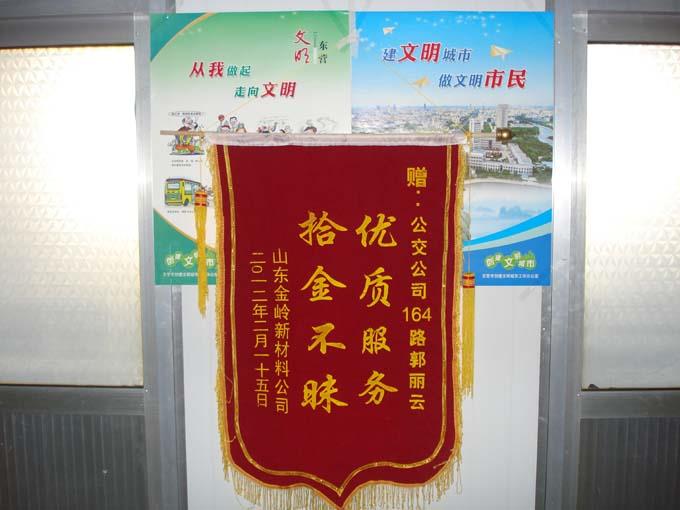 這位小伙子名叫燕同意,是山東金嶺新材料公司的一名職工,2012年2月15日上午,剛下了早班的燕同意乘坐8:40的164路返回東城,下車時將錢包落在了公交車上。跑回東城的駕駛員郭麗云在打掃車輛衛(wèi)生時看到了一個棕色的牛皮錢包,里面3000多元現(xiàn)金,4張銀行卡,1張銀聯(lián)卡,1張身份證。面對鼓鼓的錢包,郭麗云第一時間將錢包交到了車隊。并與車隊工作人員一起通過包內的卡片多方聯(lián)系,在短短不到半個小時內便將錢包送到了失主的手中。小燕問駕駛員名字,郭麗云卻怎么也不肯告訴他。小燕通過多方打聽才知道了她的姓名。時隔多日,小燕帶著感激的心情送來了一面寫有“優(yōu)質服務、拾金不昧”的錦旗。